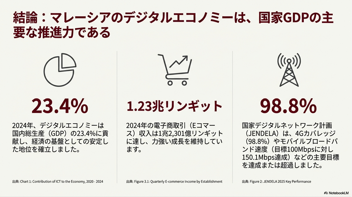 本報告書は、マレーシアのデジタル変革が多層的かつ戦略的に推進されている実態を明らかにしてきました。ICTセクターがGDPの23%以上を占めるまでに成長した経済的インパクトは、その変革の力強さを物語っています。この成功は、**国家デジタルネットワーク計画(JENDELA)**による堅牢な通信インフラの構築と、**国家Eコマース戦略ロードマップ(NESR)**によるビジネスエコシステムの育成という、両輪の国家戦略によって支えられています。その結果、個人レベルではインターネット利用率が98%に達し、企業レベルでもデジタル技術の導入が着実に進むなど、社会全体で高いデジタル導入率が実現しています。そして今、マレーシアはこれらの成果を土台に、2030年までに「包括的かつ持続可能なAI国家」となるという明確な未来像を描いています。